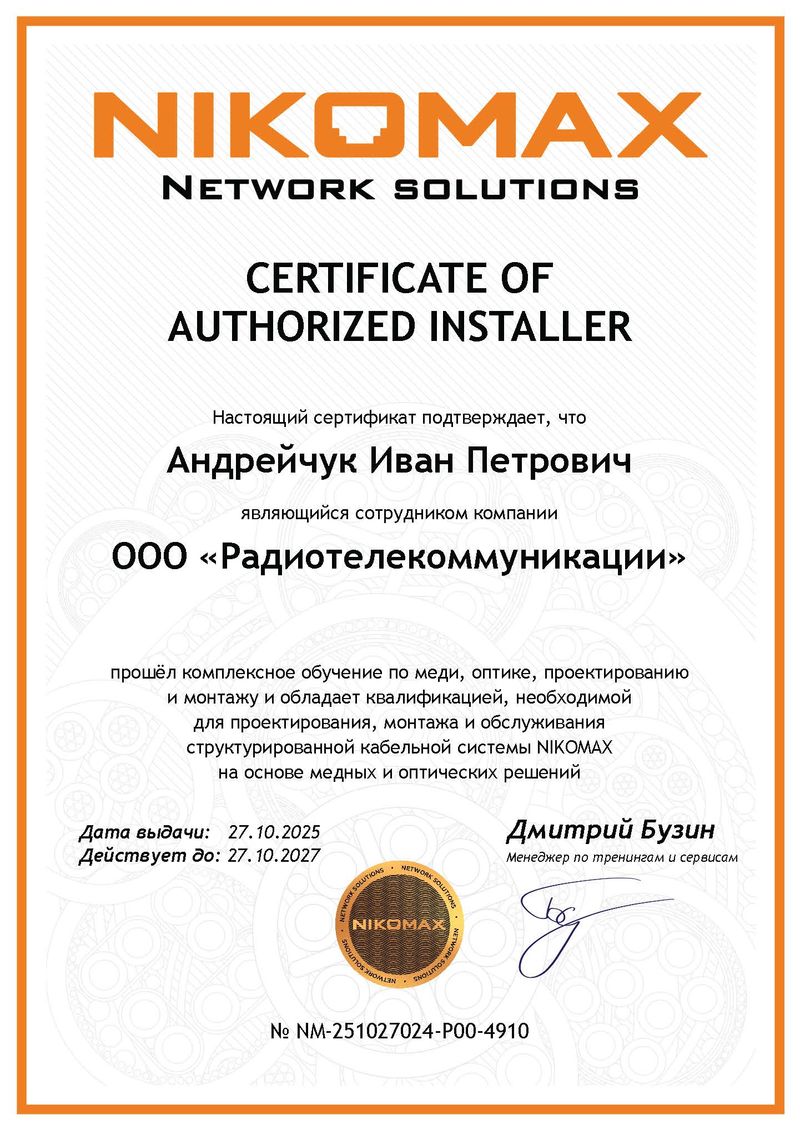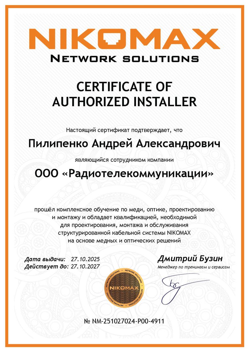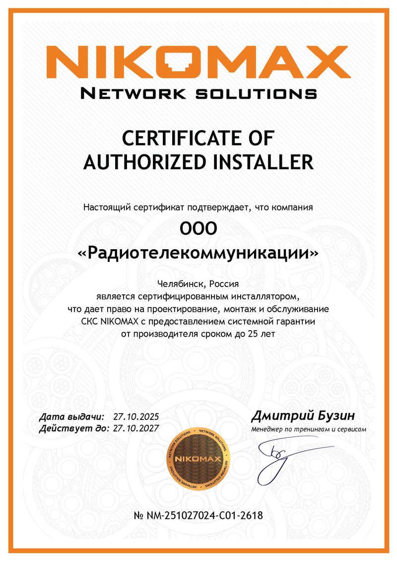 Настоящий сертификат подтверждает, что компания ООО «Радиотелекоммуникации» Челябинск, Россия является сертифицированным инсталлятором, что дает право на проектирование, монтаж и обслуживание СКС NIKOMAX с предоставлением системной гарантии от производителя сроком до 25 лет