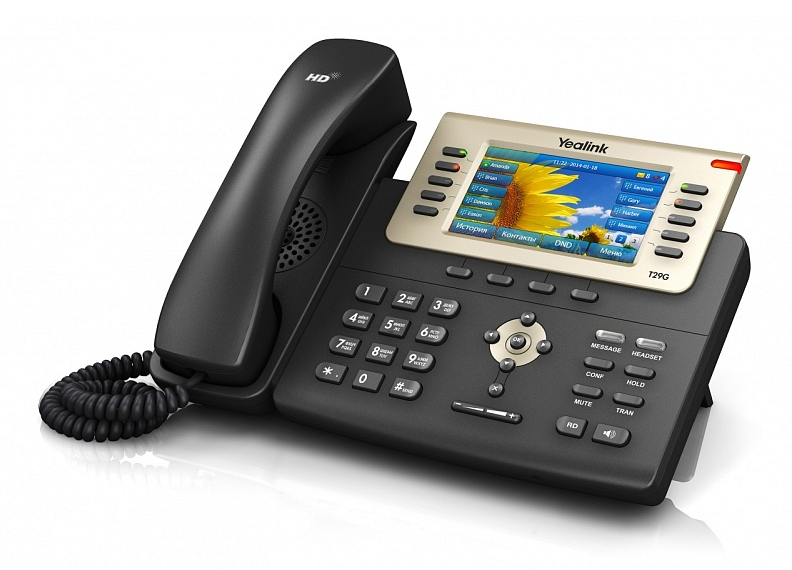 Yealink SIP-T29G является наиболее продвинутой моделью линейки Yealink T2x. Аппарат оснащен цветным TFT-дисплеем высокого разрешения, обеспечивающим удобную визуализацию; технология Yealink Optima HD позволяет передавать звук голоса собеседника особенно четко и реалистично; для подключенного через телефон компьютера передача данных осуществляется по стандарту Gigabit Ethernet. Новое для линейки Т2х расположение программируемых кнопок позволяет подписывать их значения непосредственно на экране телефона, избавляя пользователей от бумажек на корпусе аппарата, которые необходимо заполнять вручную. Переключение этих значений достигается сменой страниц экранного меню. Помимо этого, телефон обладает возможностью подключения модулей расширения программируемых кнопок, беспроводных гарнитур через электронный микролифт EHS36 или Bluetooth-гарнитур через USB-адаптер BT40.