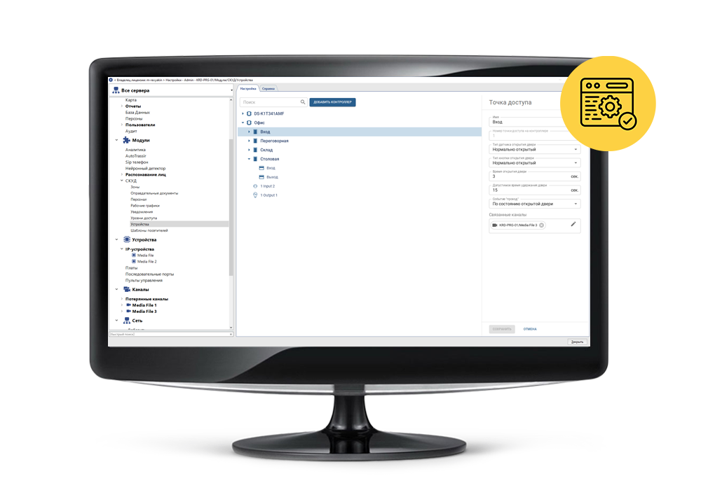 Поможет легко настраивать сценарии доступа и реакции на нарушение пропускного режима, вести учет рабочего времени, работать с временными пропусками